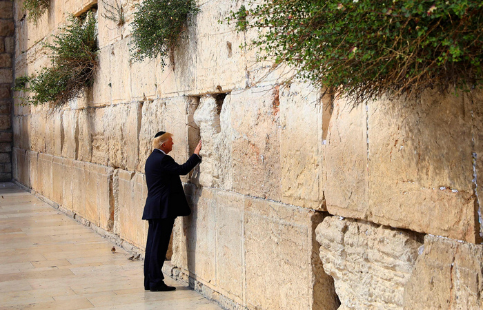 2017年5月22日,以色列耶路撒冷,美国总统特朗普抚摸着“哭墙”。12月初,特朗普意外承认耶路撒冷为以色列首都,并宣布将搬迁美国大使馆。此举引发国际社会强烈反对,多地爆发示威游行与流血冲突。同时,美国与众多阿拉伯盟友和欧洲国家的关系因此受到威胁。