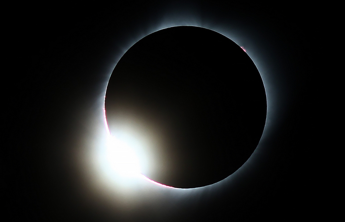 2017年8月22日,美国怀俄明州Casper,横穿美国东西海岸的日全食现象出现“钻石环效应”。在出现日食的过程中,美国部分公司休息、学校提前放学甚至直接放假,有些餐馆宣布中午12点至下午3点闭餐,没有歇业的餐馆人满为患。当地报纸、电视台等媒体谈论的全是日全食。整个美国似乎都处于停滞的状态。