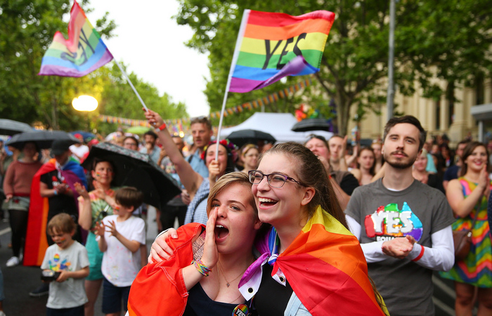 2017年11月15日,澳大利亚墨尔本,邮件“公投”结果显示多数人支持同性婚姻合法化,众多民众上街欢庆。当地时间12月7日,澳大利亚国会以压倒性优势投票通过了婚姻平权法案,该国正式成为世界上第26个同性婚姻合法的国家及地区。