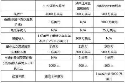 美国资本市场相对比较成熟,纽约股票市值几乎占全世界的1/2。美国公开上市市场包括:纽约证券交易所、纳斯达克全国板股市以及纳斯达克小板股市。上市条件如下: