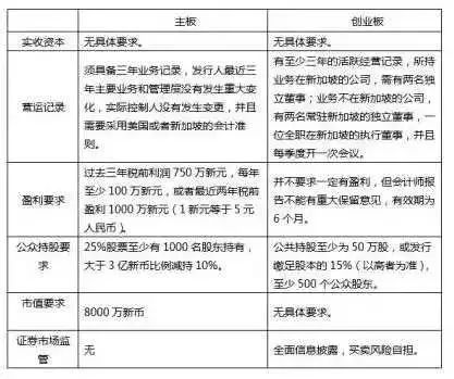 新加坡证券市场被视为亚洲主要的证券市场,为长线投资和提供了比较稳定的公司融资成长环境。此外,外国公司在新加坡交易所的上市总市值中占了40%。上市条件如下: