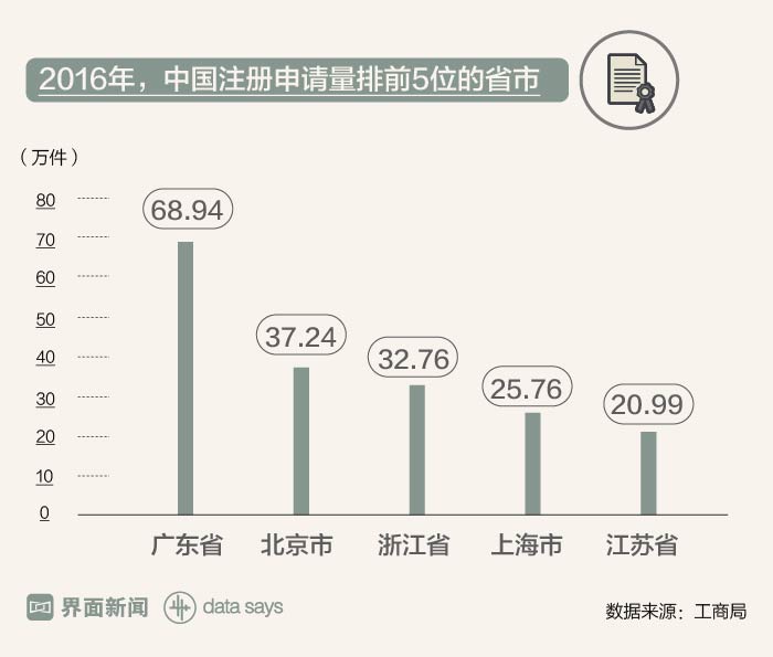 2017年1至11月,商标注册申请511万件,超出2016年全年总数的38.4%。工商局数据显示,2016年中国注册申请量排行前五的省市为广东、北京、浙江、上海、江苏,其中广东以68.94万件的显著优势,位列第一。