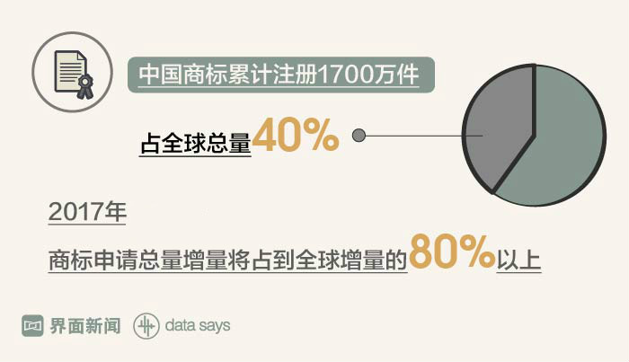2017年,中国商标申请总量增量将占到全球增量的80%以上。如今,中国商标注册申请量第16年位居世界第一,商标累计注册量1700万件,总量占全球的40%。