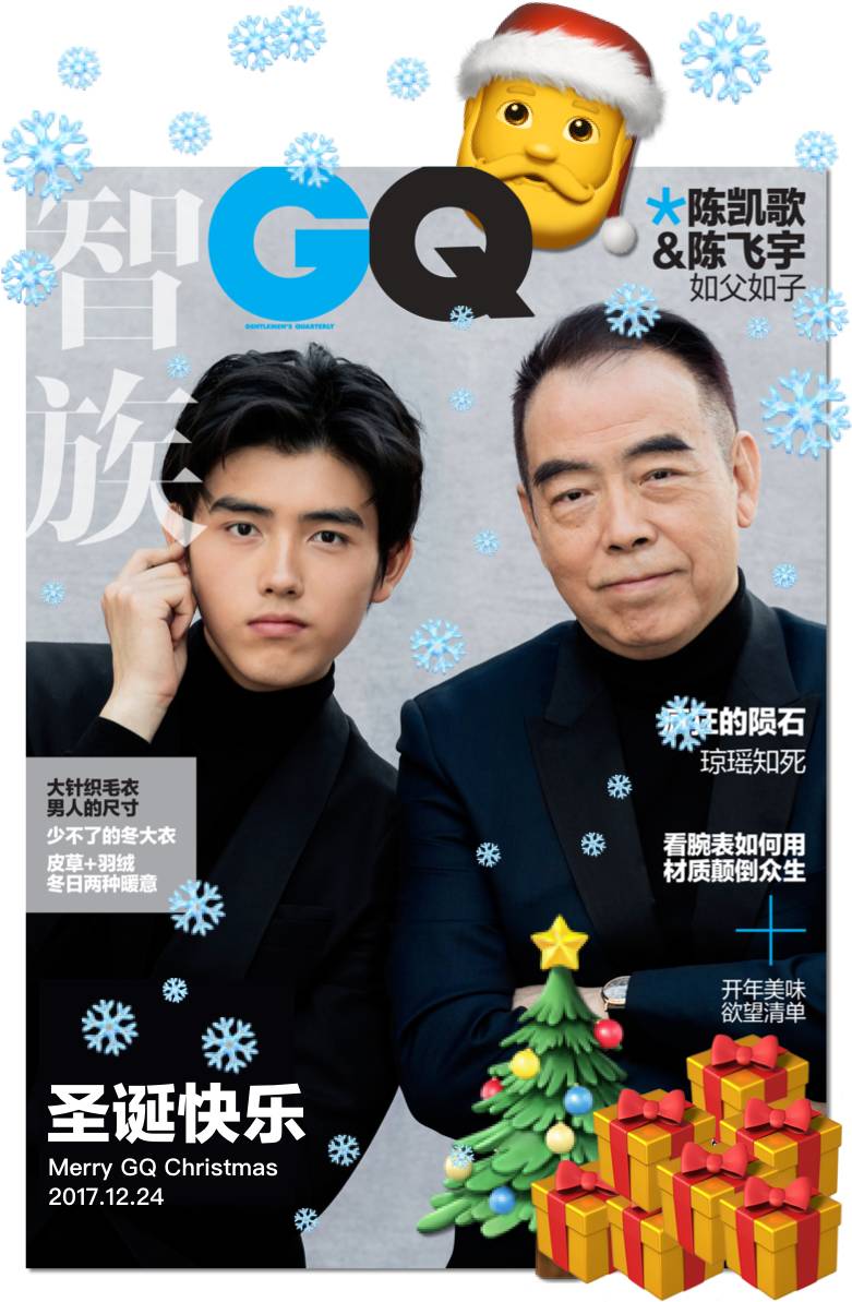 有趣的是,其实2018年开年刊正式的封面是陈凯歌的单人照,但是当时在现场拍摄的这一张导演和儿子陈飞宇的双人照用作封面也特别温馨动人。所以我们特意在圣诞前夜制作了一个微信版特别封面,也是给大家的圣诞小祝福吧。