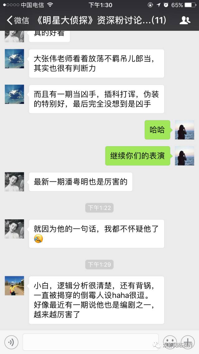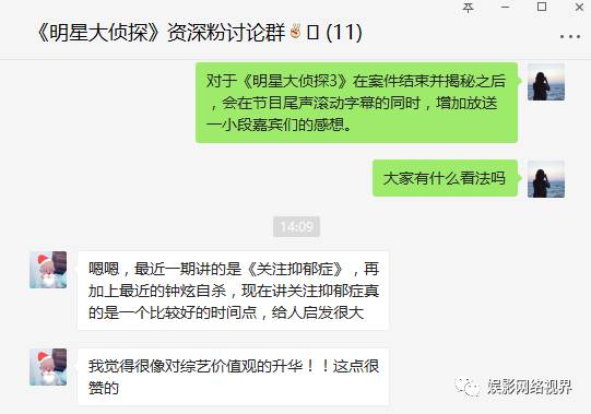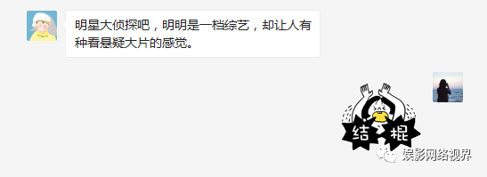 “明明是一档综艺,却让人有种看悬疑大片的感觉。”是聊天快结束时,群里一位粉丝说的话。能将一档综艺做出电影大片感觉的节目确实少之又少,这或许就是《明星大侦探》受欢迎的原因之一吧。