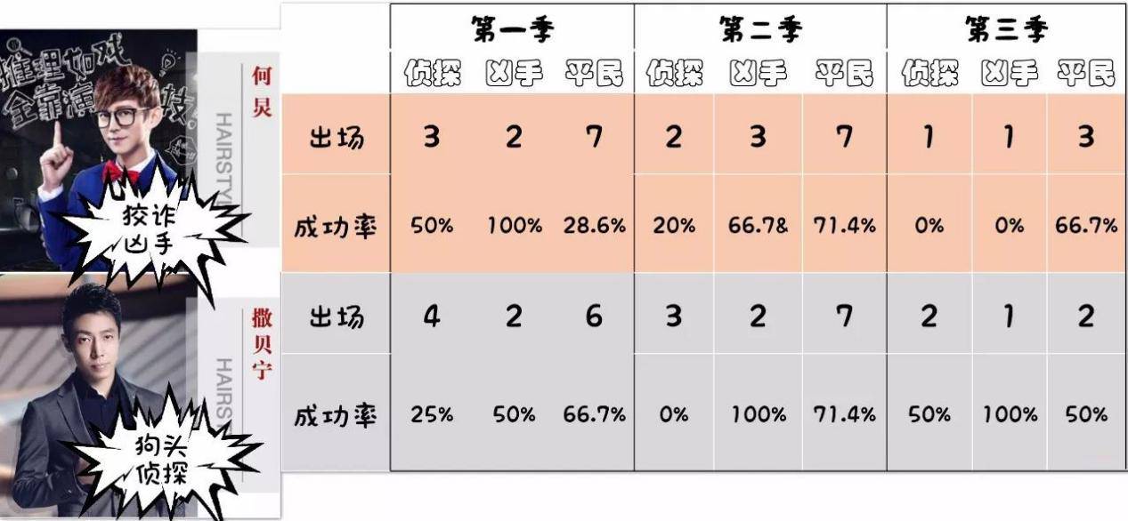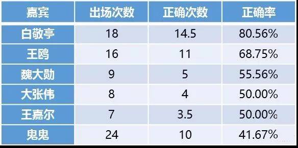 网上还有专门统计了几位不同季的常驻嘉宾的破案成功率的相关数据。其中,撒贝宁与何炅一起承担了节目几乎80%的推理,而破案成功率最高的是年龄最小的白敬亭,其次是直觉超级准的王鸥。
