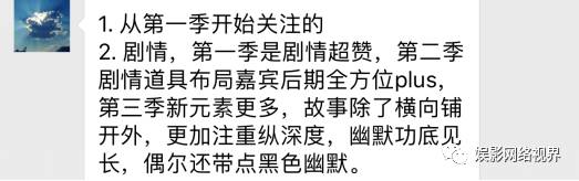 综合对比了前三季,粉丝小F在交流群分享了自己对于以上这种新尝试的看法。“第一季是剧情超赞,第二季剧情道具布局嘉宾后期全方位plus,第三季新元素更多,故事除了横向铺开外,更加注重纵深度,幽默功底见长,偶尔还带点黑色幽默。”