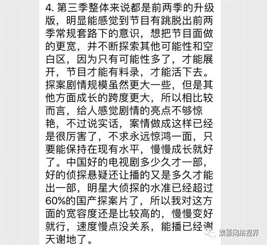 以上是用户对于《明星大侦探》的建议,在娱影君看来,这也是当下许多综艺尤其是“综N代”节目应该借鉴和完善的地方。希望,在未来的综艺市场中,能有越来越多像《明星大侦探》这样真正收视与口碑齐飞的好节目出现。