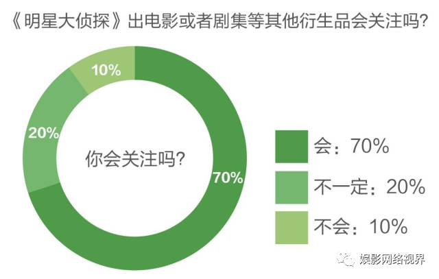 就“《明星大侦探》出电影或者剧集等其他衍生品会关注吗?”这个问题的回答,可以看到,80%的人表示会继续关注,原因是他们觉得这个综艺已经成了一块招牌,他的衍生品只要是同团队制作,品质都不会太差;而表示不会或者不一定会关注的用户则担忧打着《明星大侦探》的旗号,随意糊弄观众,最后反而毁了这块招牌。