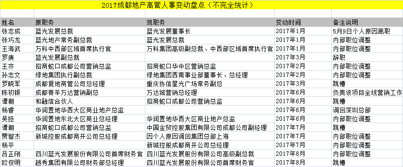 在成都奔向国家级新中心城市的道路上,其所展现出的巨大城市魅力,吸引了全国各大地产商挤进成都,地产行业的竞争日趋激烈,如此,使得人才的作用更为突显,成为成都房地产市场人事频繁变动的主要因素。据不完全统计,2017上半年成都楼市发生了15起高管职位变动事件,后半年也有包括谭朝转入金贸,蓝光吕正刚晋升公司高级副总等消息。