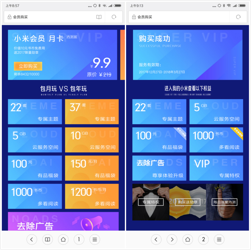 虽然还处在内测阶段,但每日限量的年卡购买资格依旧难以获得。仅27日上午,官方显示小米会员内测月卡售出了超过2500份。
