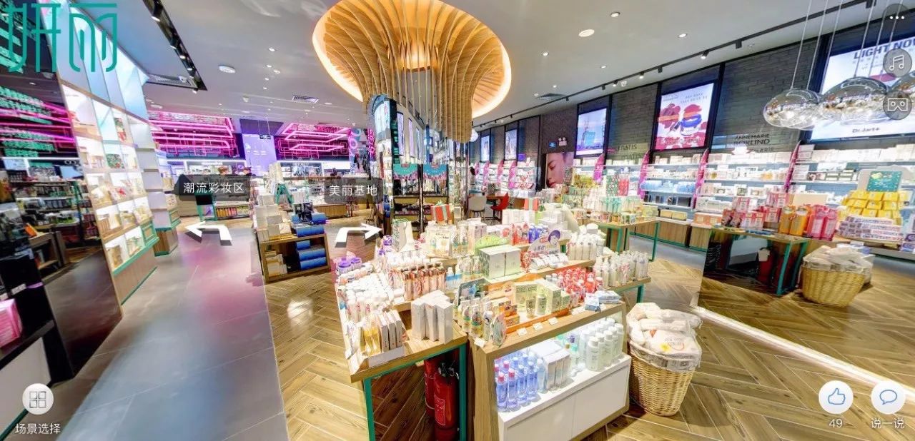 例如,全方位立体LED巨幕演绎着多元化的品牌文化内涵;全球国际大牌化妆品最佳T台秀区在镜面与富有现代感的圆形吊灯交相辉映中散发出奢华的质感;舞台感十足的试妆空间让顾客体验定制化的专业美妆服务;可容纳50个席位的私密美丽空间充分挖掘顾客生活方式需求......