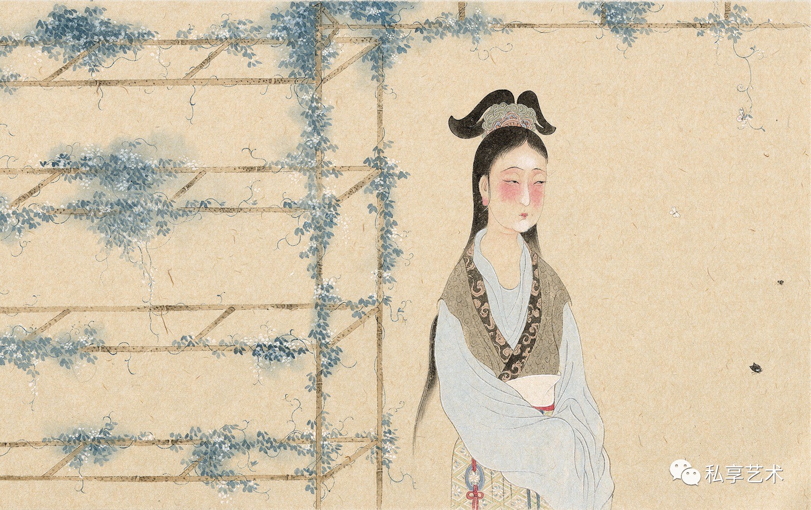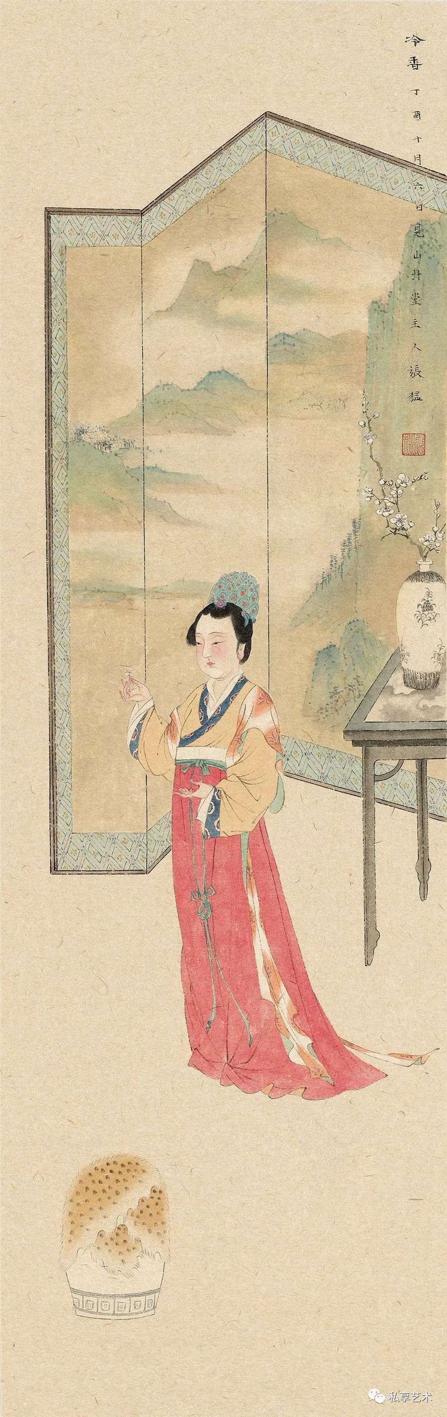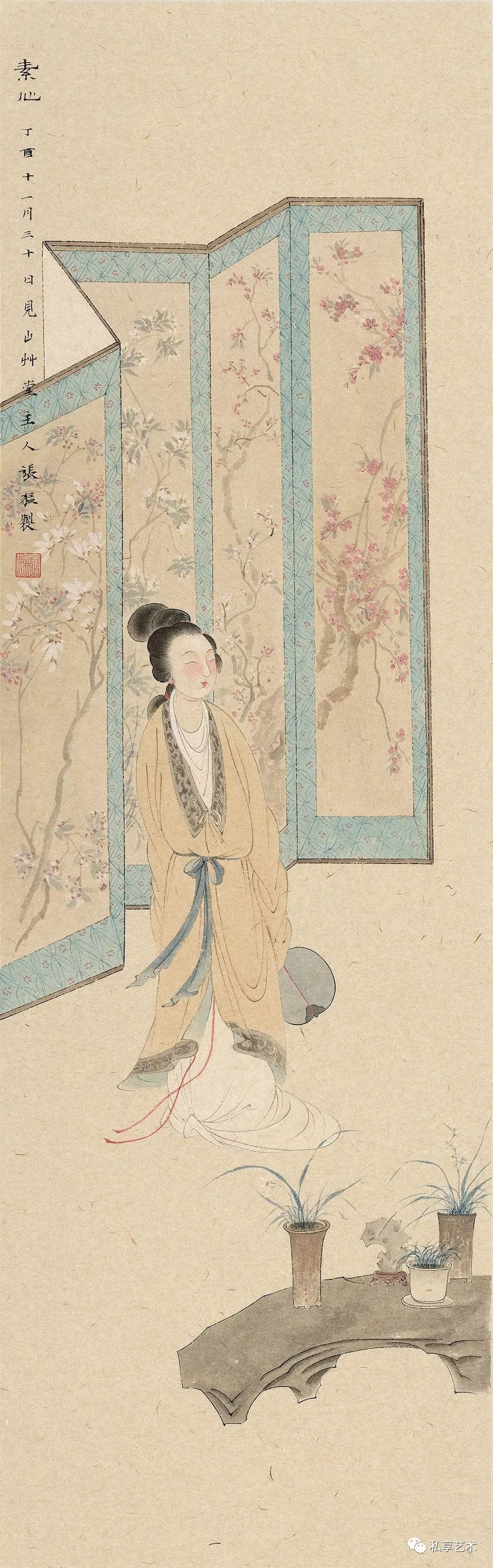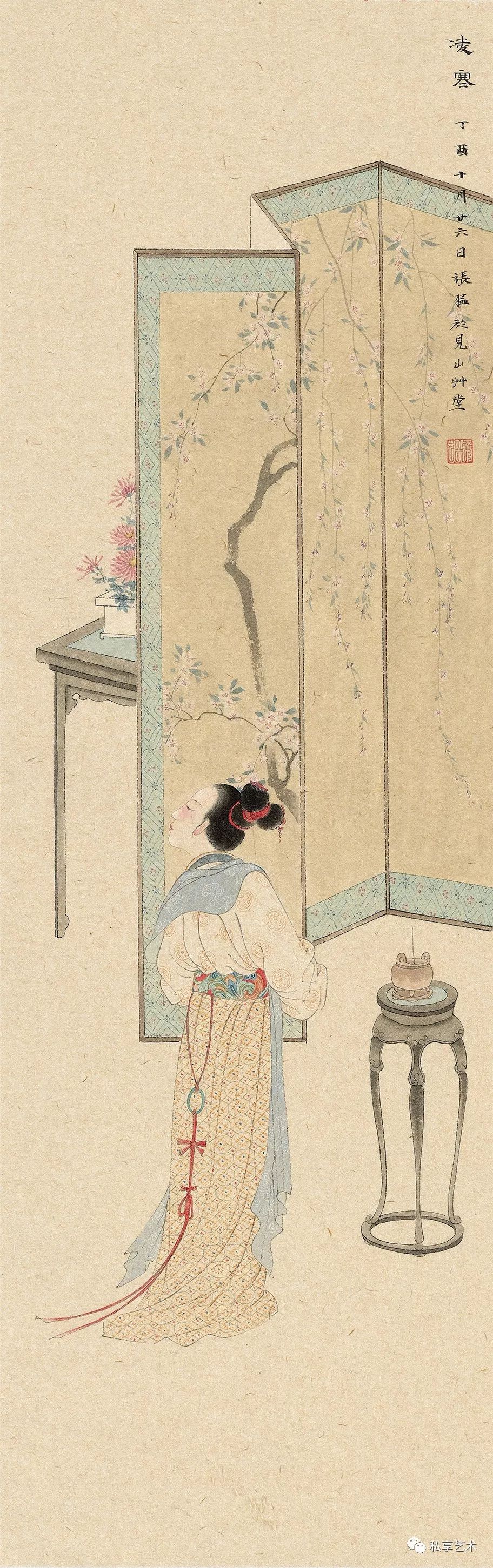 工笔画以再现的形式展示了主体对于客体的观察、体悟与表达,研精究微,探画道堂奥。相对而言,写意画则更多的采取了表现的形式,盎然意趣,形态焕然,蔚为大观的文人画的历史演进,从侧面展示了写意画的历史文脉。如唐寅《秋风纨扇图》,借用缘起于班婕妤的闺怨题材“秋扇见捐”,间接传达他本人内心的情思,画面辅以小诗“请把世情详细看,大都谁不逐炎凉”,更加明确的点出画者心境。而具体就工笔画言,其诗意表达的特质不但表现在题画诗的抒情言志,而且还体现在创作主体心理意象的诗化。