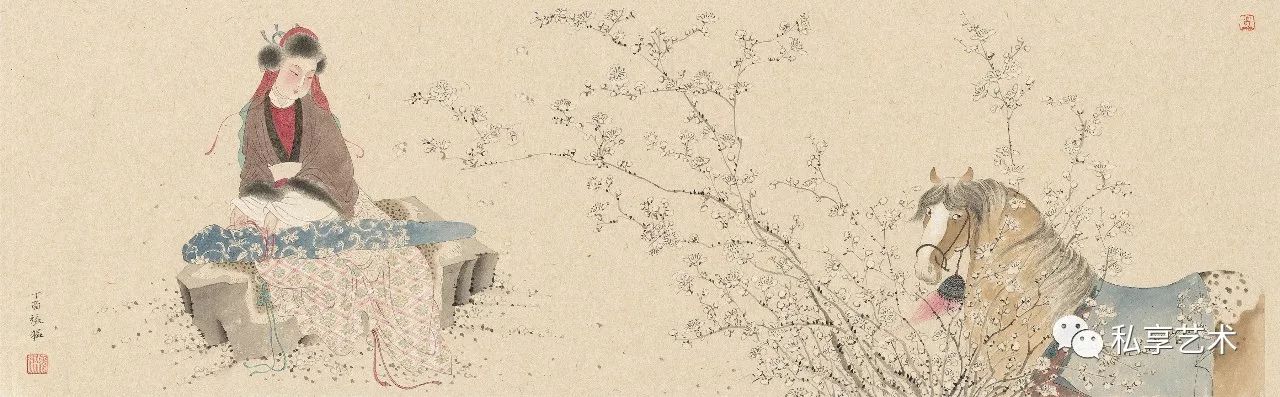 而在以工笔表现闺怨题材的,可凭张萱的《捣练图》窥见一斑。《捣练图》所依据的文学题材乃是流行于南北朝的“捣练诗”。如南朝女诗人谢惠连《捣衣诗》所言:“纨素既已成,君子行未归。裁用笥中刀,缝为万里衣。”此类文学题材缘起于南北朝战争男子戍边,女子寄送制作的御寒衣物给男子的现实现象,因而被引入诗中。张萱所绘《捣练图》便是此类传统的延续。该画对捣衣工序的再现,对女性神态、动作的塑造,以及对发饰、配饰的精雕细琢,突出展现了工笔画“再现”现实乃至“再现”理想时空的优越之处。线条的秩序感与节奏感、色彩的美感,尤其是通过人物神态、动作、眼神等等丰富而感人的细节,展示了每一位劳动中的女性的不同特点,又展示了她们共有的劳动之美和情感之动人。