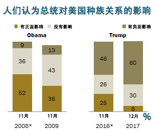 对这个问题的看法在奥巴马执政时期则大有不同。持正面积极态度的人在奥巴马就职后的2009年达到了一个高峰,当时有66%的人认为种族关系总体不错。然而,到了2014年和2015年,随着一些黑人平民被枪击的案件频繁发生,人们感受到种族矛盾的压力,认为“种族关系不错”的人所占的比例2015年时跌到了34%,另外有56%人认为种族关系非常糟糕。