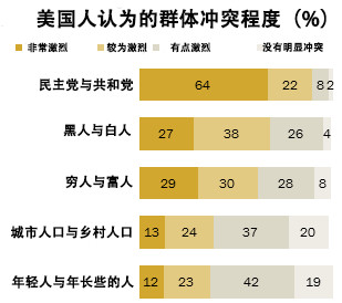 但是在特朗普上台之后,人们对群体冲突认知的最大改变还不在种族问题上,认为穷人与富人之间有非常激烈的冲突的比例就比种族冲突更高。然而认为政党间的冲突非常激烈和较为激烈的受访者分别占64%和22%,从数据上说明自特朗普当选以来的两党分裂并没有得到改善。