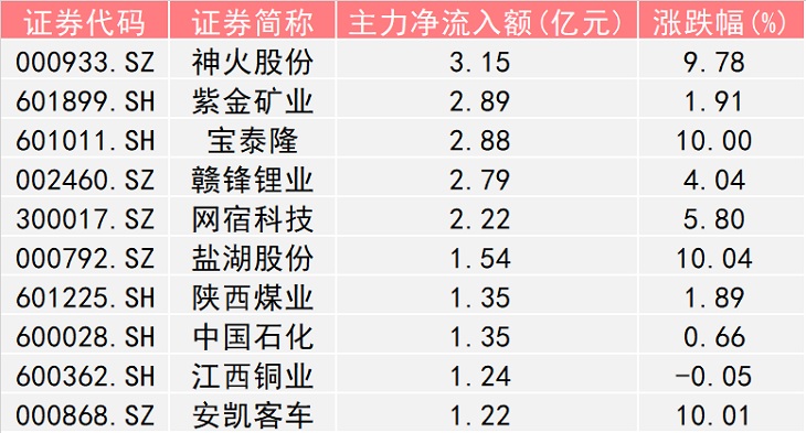 神火股份(000933.SZ)、紫金矿业(601899.SH)、宝泰隆(601011.SH)主力净流入额分别为3.15亿元、2.89亿元、2.88亿元。这其中,神火股份、宝泰隆股价涨幅更是显著,分别上涨9.78%、10.00%。陕西煤业(601225.SH)、江西铜业(600362.SH)主力净流入额同样跻身前列,分别净流入1.35亿元、1.24亿元。此外,因新能源汽车购置税免除时间消息落地,新能源汽车概念股尾盘时分直线拉升,安凯客车(000868.SZ)直线拉涨停,并实现1.22亿元的主力资金净流入。