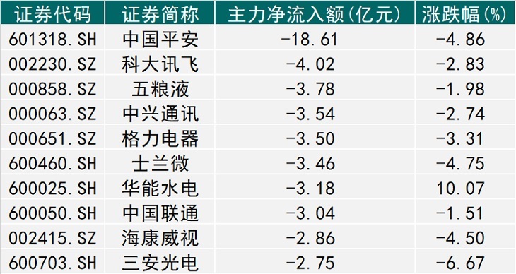 中国平安(601318.SH)、科大讯飞(002230.SZ)、五粮液(000858.SZ)今日主力净流出额居前三位,分别净流出18.61亿元、4.02亿元、3.78亿元。中国平安今日股价下跌4.86%。