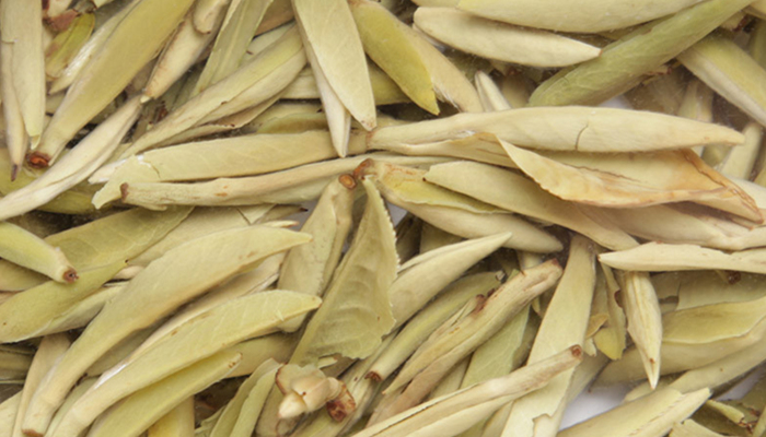 芽头肥壮,满披白毫,自然舒展,匀整度高,带少量鱼叶,呈墨绿色,偶有单片,干茶清香。