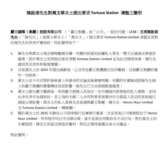 这份声明中特别提到,万玉华辞任霸王职位后,利用霸王创始人的身份,在中国境内经营其私人业务,并因此涉及多宗金钱纠纷,她在上海的夫妇二人共有物业也被广州市白云区人民法院宣布进行网络公开拍卖。万玉华的私人业务及负债与霸王集团、陈启源、Heroic Hour Limited及Fortune Station一概无关。