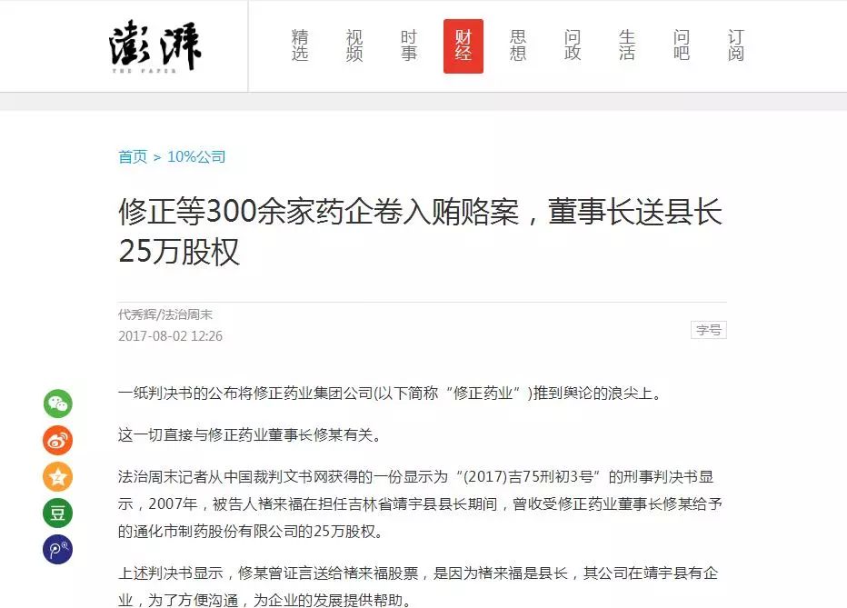 有份公示的吉林省延边林区中级法院的刑事判决书((2017)吉75刑初3号),砸中了修正药业。该判决书显示,2007年,被告人褚来福在担任吉林省靖宇县县长期间,曾收受修正药业董事长修某给予的通化市制药股份有限公司的25万股权。上述判决书还显示,修某曾证言送给褚来福股票,是因为褚来福是县长,其公司在靖宇县有企业,为了方便沟通,为企业的发展提供帮助。