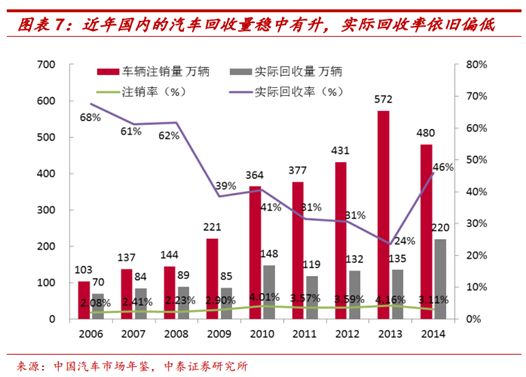 车辆注销比例与实际回收率依旧偏低:总的看近些年来,我国报废汽车注销比例(当年汽车注销量与汽车保有量之比)和汽车实际回收率(当年报废汽车回收量与当年汽车注销量之比)一直都很低,这与国外发达国家差距很大。2014 年我国汽车注销量481 万辆,测算我国回收拆解企业实际回收报废汽车量在220 万辆左右,占汽车注销量的45.7%,即约有一半以上被注销的报废车辆没有流入正规的报废拆解市场。