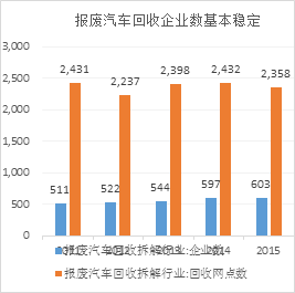 截至2015 年,全国获得拆解资质的企业数量603 家;隶属回收网点2358 个。报废汽车回收网店已覆盖全国80%以上的县级行政区域,从业人员2.8 万余人。