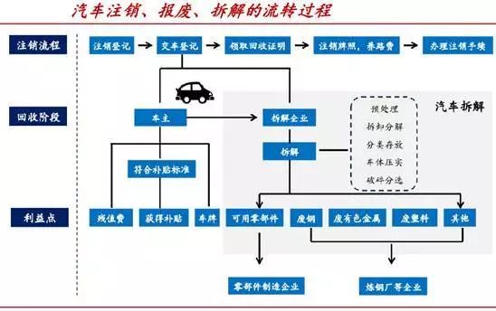 汽车拆解是汽车报废后的后处理过程:车主报废车辆可以获得残值费,若报销车辆符合补贴标准,可获得国家补贴。而拆解企业通过将报废汽车拆解成可用零部件、废钢、废有色金属等获得回收收益。