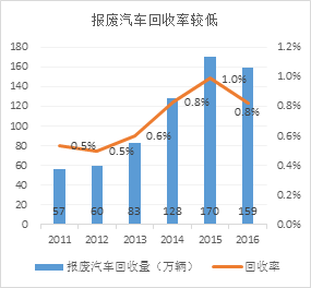 2016年全国回收拆解汽车报废汽车159万辆,占汽车保有量的0.8%(当年汽车回收量与汽车保有量之比)。从回收比率分析,我国的汽车报废率一直在1%附近徘徊,远低于发达国家的5%-8%的水平。若按国外的数据简单估算,每年我国汽车的报销量为1000万辆左右。