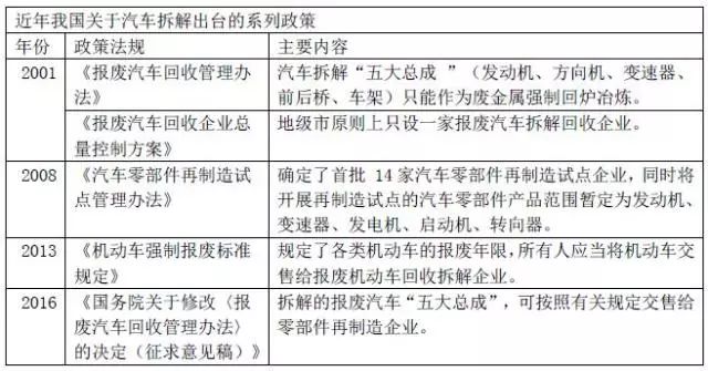 从2001年颁布《报废汽车回收管理办法》明确了报废汽车车主和回收企业的行为规范,报废汽车回收监管部门职责分工,以及地方政府报废汽车回收工作职责。报废汽车拆解行业开始规范化。