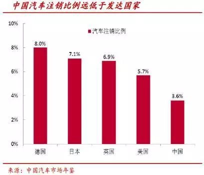 中国汽车注销率有大幅上升空间: 世界产车大国德国日本的注销率最高,其次是英国和美国,平均在 6-7%左右,中国的注销率只有3.6%,与发达国家比还有很大增长空间。主要是2009-2010 年是我国汽车消费逐渐增长期,按照10-15 年报废期计算,2020 年左右汽车报废量预计才步入高峰,届时汽车注销率会显著提升,到2022年逐步达到5.5%的水平。