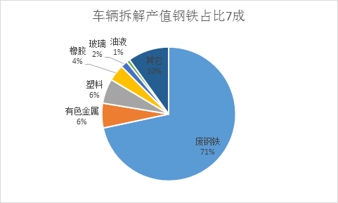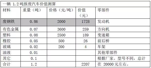 目前车辆拆解产值只有2000-3000元。报废汽车中含有72%的废钢铁、6%左右的废塑料、4%左右的废橡胶和6%左右的废有色金属,基本上可以全部回收利用,以一辆1.2吨的报废汽车为例,若全部作为废旧材料处理,价格在2000~3000 元左右,若拆解下的零部件进入再制造环节流通,则估算价值可达2 万元左右,是作为材料回收再利用价值的6~7 倍。