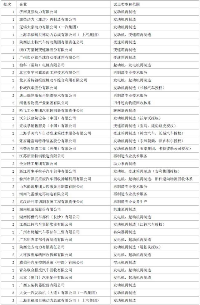 截止目前,发改委已经发布三批再制试点单位和产品名单,共有42家企业获准进行9类零部件的再制造。