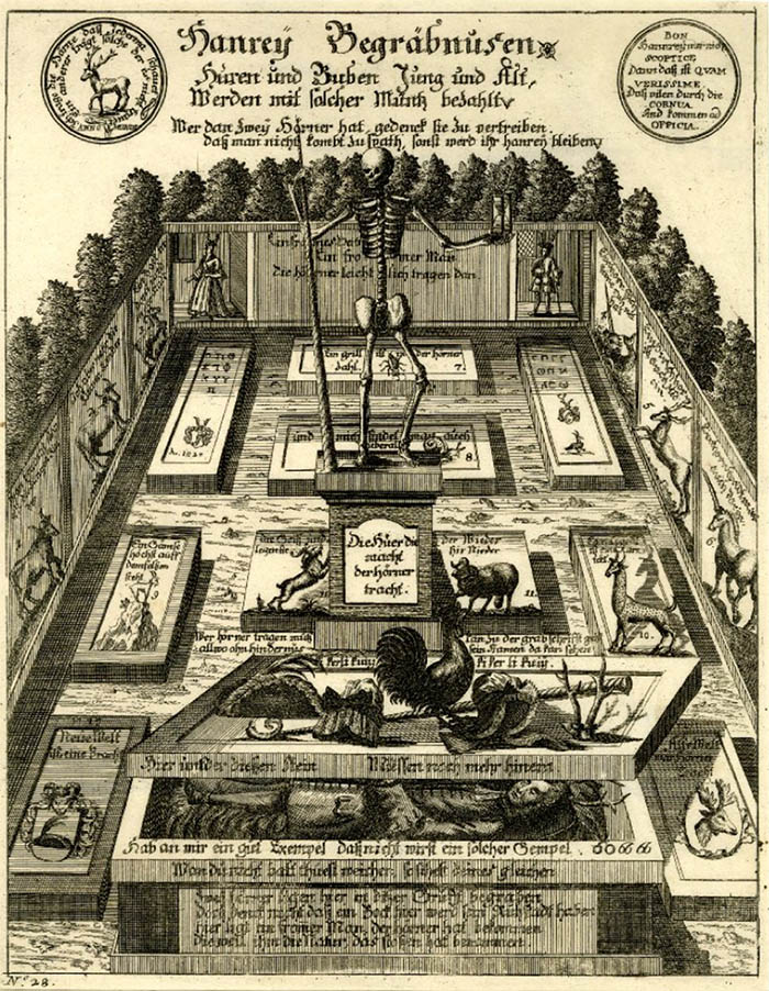 当然,布谷没有长角。因此有无数理论来解释长角和妻子不忠之间的关系,比如18世纪的德国画作《戴绿帽子男人的坟墓》(Hanrey Begrabnusen),画了一系列长角的动物作为来源。