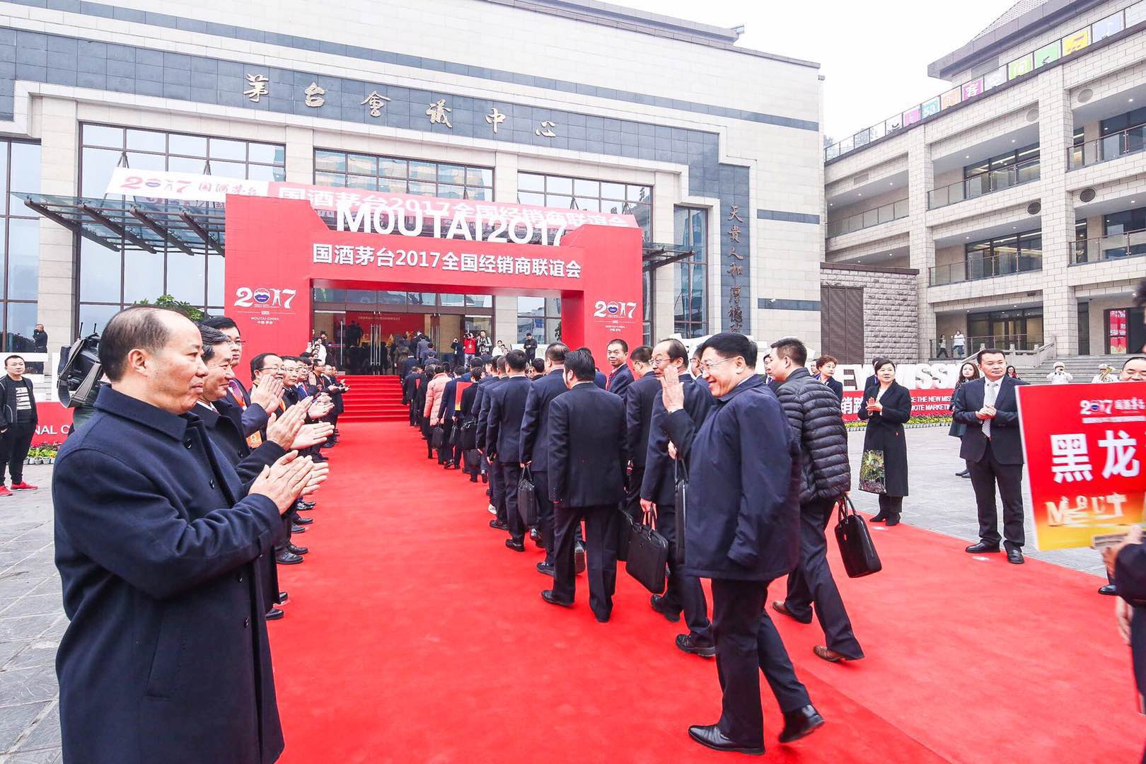 界面新闻记者现场参与此次经销商大会。12月28日上午8点30分,超过1000名来自全国31个省份的经销商陆续进入茅台会议中心,茅台集团公司董事长袁仁国、茅台集团党委书记、总经理李保芳带领近20位茅台集团高层在入口处列队欢迎。