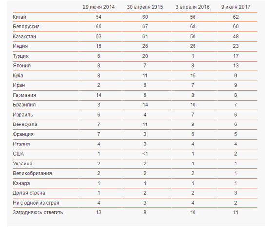 社会舆论基金会的研究显示,62%的俄罗斯人认为中国是俄最“亲近和友好”的国家。相比之下,2014年该数据为54%。同时,认为白俄罗斯是主要朋友的俄民众数量从2014年的66%下降至2017年的60%。