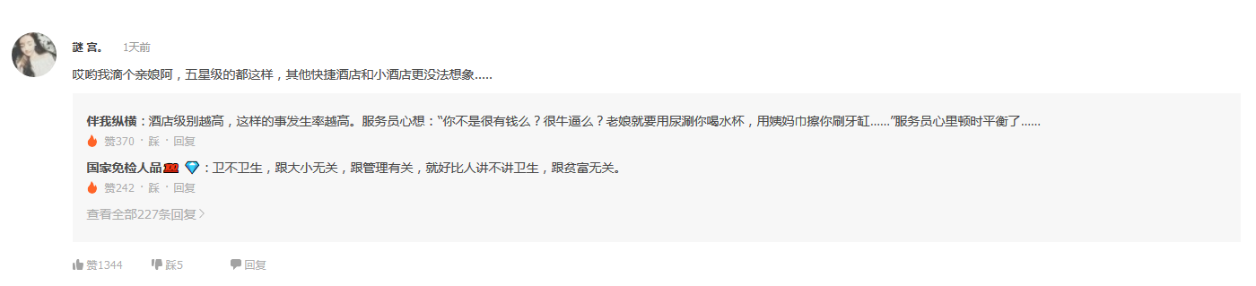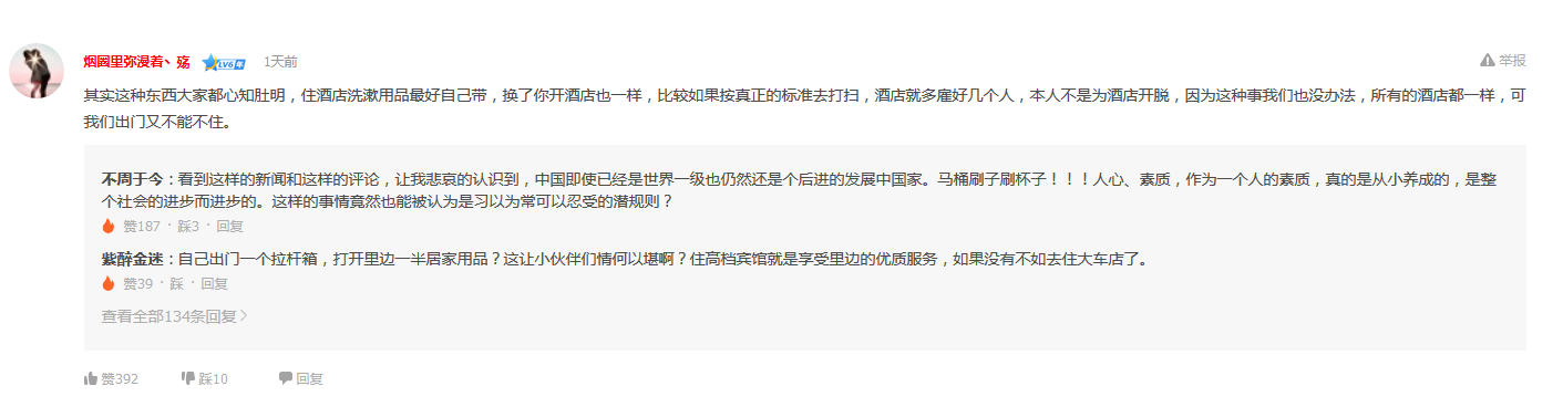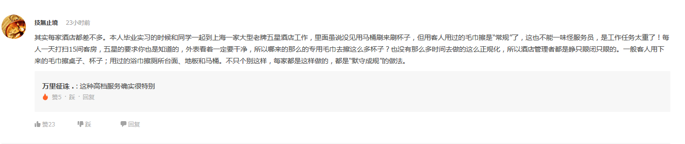 也有的网友表示,这根本不是个别现象,这种情况在任何各种级别的酒店都属于普遍现象。