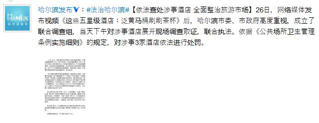 视频在网络上一经曝出,哈尔滨市委、市政府高度重视,成立了联合调查组,当天下午便对涉事酒店展开现场调查取证,联合执法。
