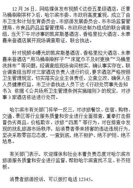 经调查组现场询问核实,确认涉事的凯宾斯基酒店、香格里拉大酒店、永泰喜来登酒店的确存在“用马桶刷刷杯子”“床尾巾不及时更换”“马桶里洗抹布”等卫生问题。联合调查组当即对三家酒店负责人进行约谈,并依据《公共场所卫生管理条例实施细则》的规定,对涉事的3家酒店依法进行处罚。