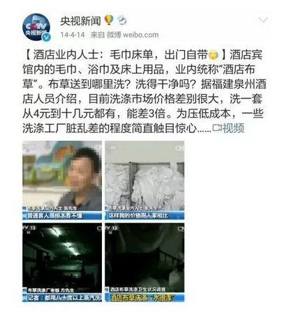 2014年4月,央视新闻采访了福建泉州酒店内部人士,他表示酒店为了压低成本,将毛巾及床上用品都送去不符合规定的洗涤工厂,其脏乱差的程度堪称触目惊心。