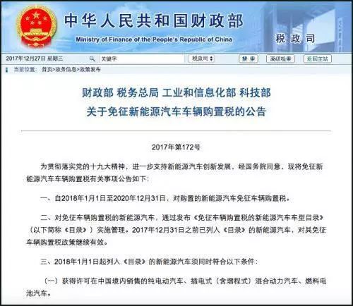 12月27日,财政部等部委共同发布公告:明年起至2020年12月31日,对购置的新能源汽车免征车辆购置税。受此消息面上的重大利好,昨日午盘,新能源汽车板块突然爆发,整个汽车板块集体异动。