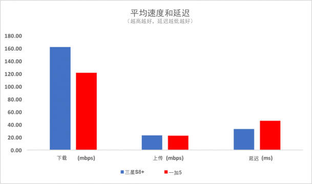 三星盖乐世S8+ vs. 一加5平均速度和延迟。
