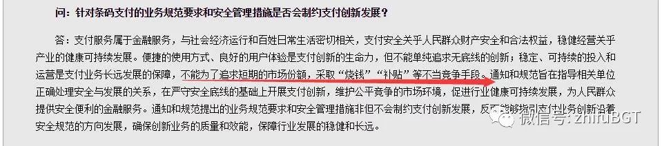 马云先生先有10亿元现金红包推广,又有再加10亿奖励金。因此诞生了一大批羊毛党和小富豪诞生,赚取百万毕竟在少数,十几万二十几万的倒是大有人在。正当炉火纯青、势头正猛,就在昨日2017年12月27日,央行发布了【银发〔2017〕296号】条码支付业务规范(试行)。再随后的记者问答上央行发言人明确提到了不正当竞争、“烧钱”“补贴”等字眼,虽然没有明确点名批评谁谁,但是暗指近期正在烧钱推广支付宝的意思已经很明显。