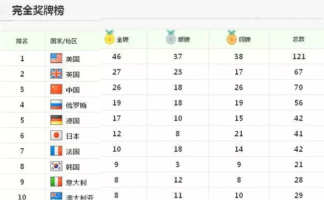 ▼2016年里约奥运会金牌榜,中国屈居第三,日本升至第六