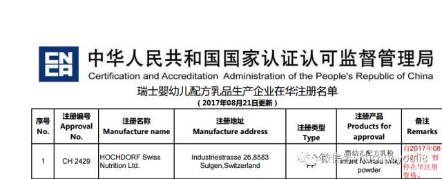 另外,国家质检总局今年7月31日通告显示,瑞士宾博有机婴儿配方奶粉因细菌总数超标不得入境;8月16日,上海食药监局通报1批次原产国是瑞士的瑞乐恩幼儿配方奶粉菌落总数超标。而这两个产品均由瑞士HOCHDORF SwissNutrition Ltd.的奶粉厂代工生产。8月21日,国家认监委宣布,该工厂暂停在华注册资格。