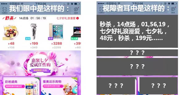 这中间又以电商App更为恶劣。电商产品以大幅的促销信息、五颜六色的广告吸引用户,且对读屏软件的兼容性差。视障人群使用体验尤其糟糕。
