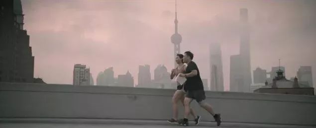 画面中,祝子和陪跑员一起,从上海的地标建筑前奔跑而过。