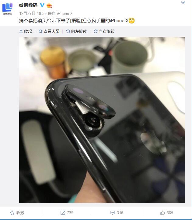 近日,微博上有网友表示,自己在摘除iPhone X的手机套时,手机的镜头也随之脱落。目前该问题是否iPhone X普遍质量问题尚未明确。