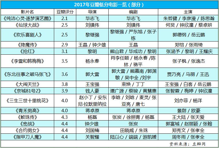 从2017年的烂片海洋中,文创资讯选出了15部比较有代表性的豆瓣低分电影,见下表: