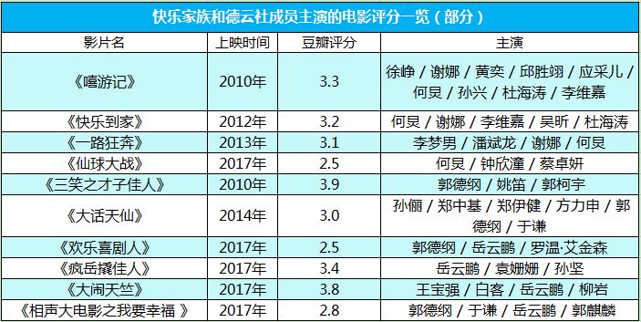 除了快乐家族,德云社似乎也自带“烂片基因”。前几年郭德纲主演的《三笑之才子佳人》、《大话天仙》、《越光宝盒》等电影,无一不是口碑惨淡。而在今年,无论是德云社成员参演的《欢乐喜剧人》、《相声大电影之我要幸福》,还是岳云鹏主演的《疯岳撬佳人》和《大闹天竺》,豆瓣评分都在2-3分徘徊,扑街扑得鼻青脸肿。
